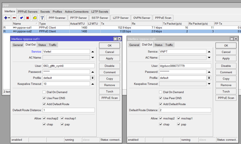 Kết nối nhẹ khi đi qua pppoe-out2kết nối nặng qua pppoe-out1