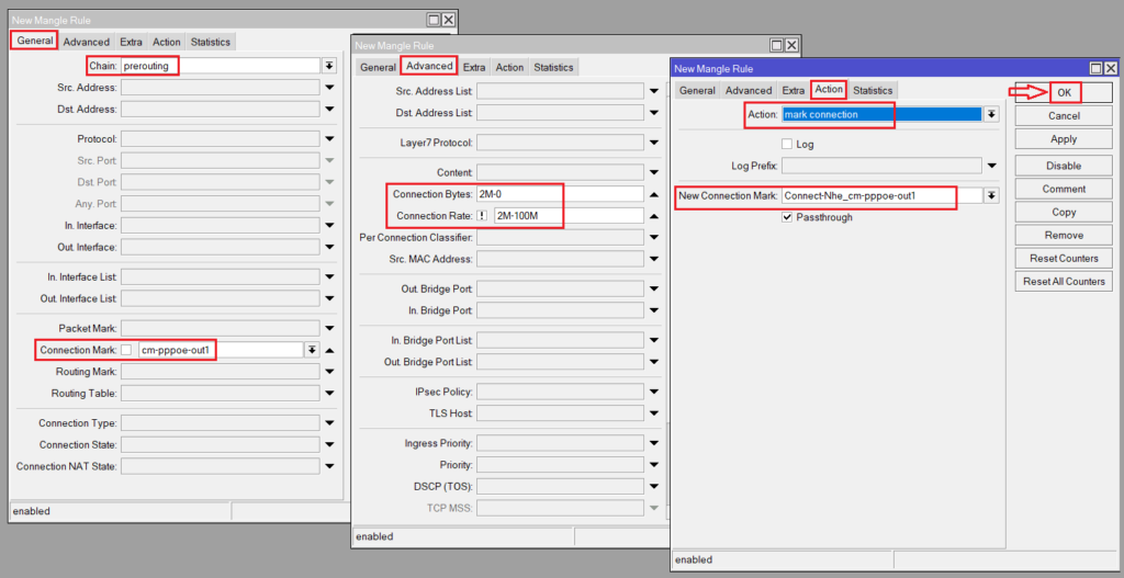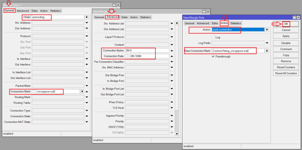Rule 5: Đánh dấu kết nối đi qua pppoe-out1 là kết nối nặng khi có lưu lượng 2M đến 100M