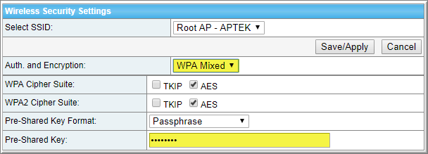 - Auth. And Encryption: Chọn chế độ mã hóa (WPA- Mixed )