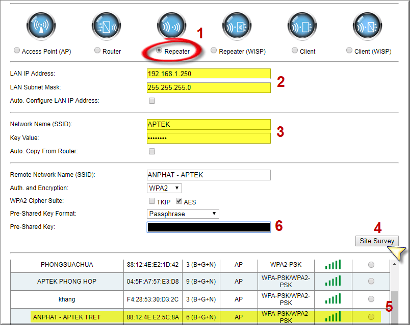 - Pre-shared Key: Điền password WIFI muốn Repeater