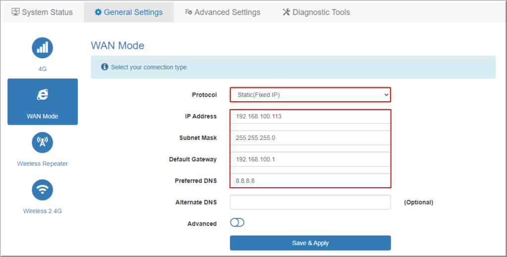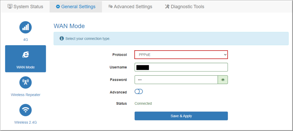 • Vào General Setup >> WAN mode, cấu hình WAN kết nối internet tùy theo từng trường hợp