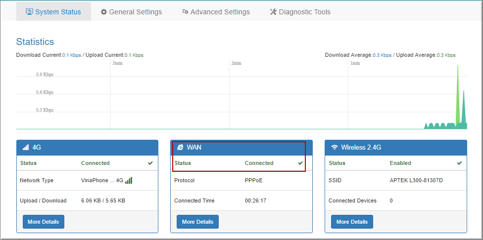 • Kiểm tra trạng thái kết nối, Vào System Status, WAN Status báo “Connected” là đã kết nối thành công