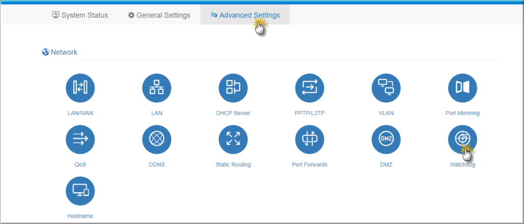 Vào Advance Settings, Tại Network, chọn Watchdog