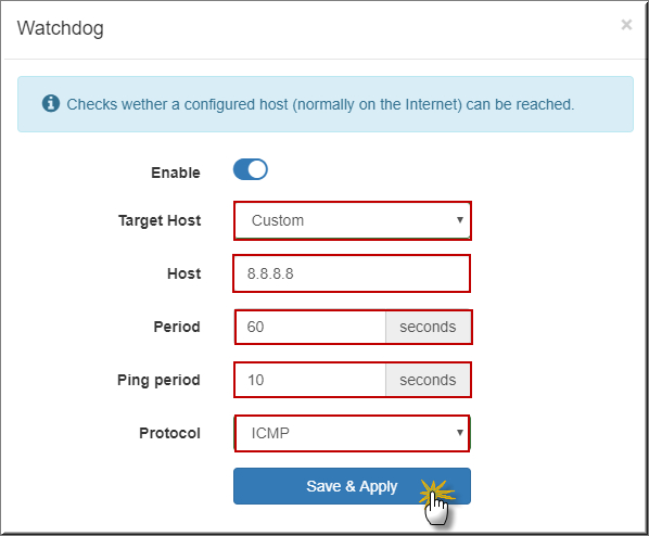 • Host: Điền IP đáng tin cậy ngoài Internet (thiết bị sẽ ping đến IP này để kiểm tra trạng thái Internet, ví dụ IP DNS google 8.8.8.8)