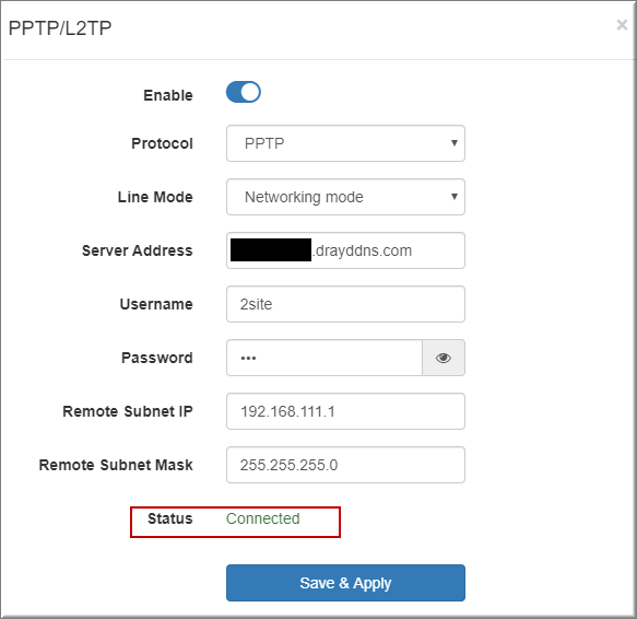 Vào Advanced Settings >> PPTP/ L2TP, mục Status đã báo connected
