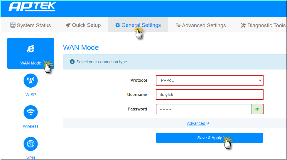 2. Nối đường truyền trực tiếp từ Converter hoặc Router nhà mạng đã cấu hình Bridge mode vào cổng WAN trên APTEK như hình