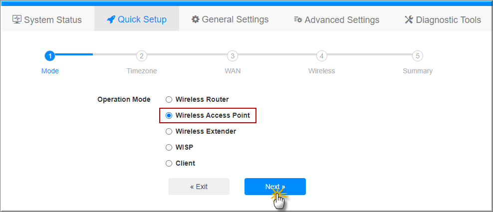 - Chọn chế độ hoạt động: “Wireless Access Point” >> nhấn Next