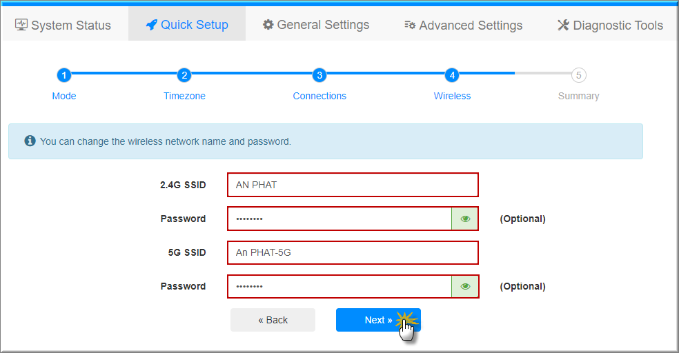 Cấu hình tên và mật khẩu Wi-Fi cho tần số 2.4G và 5G