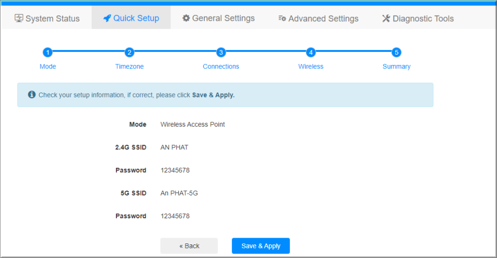 - Kiểm tra lại thông tin đã cấu hình >> nhấn Save & Apply. Thiết bị sẽ reboot và kết nối được Internet