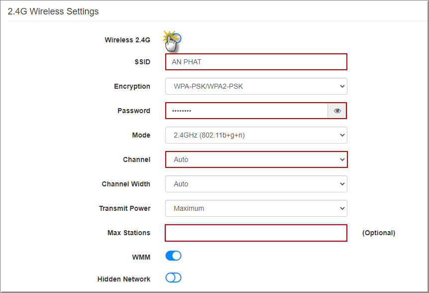 - Tại Wireless 2.4 Settings: điều chỉnh các thông số như sau: