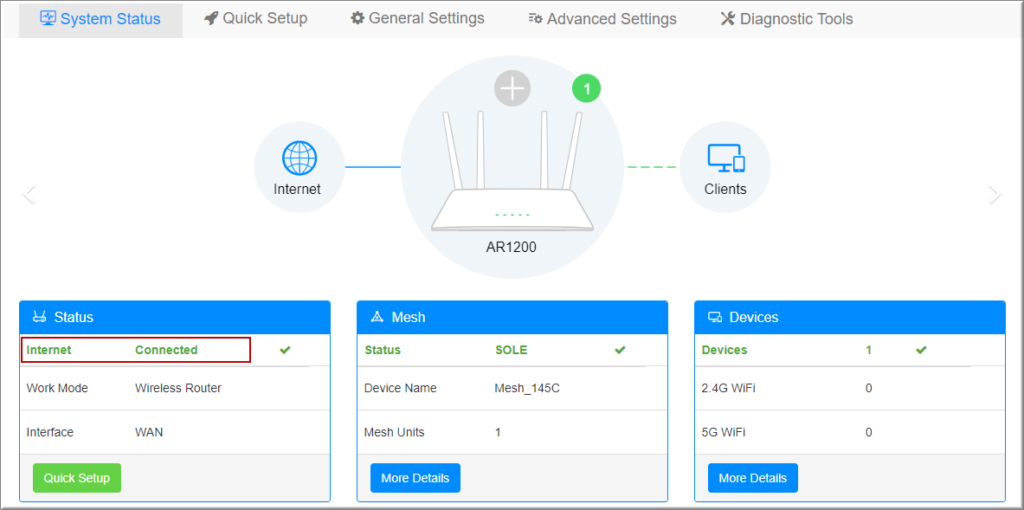 Vào WAN >> System Status , kiểm tra trạng thái internet đã báo Connected.