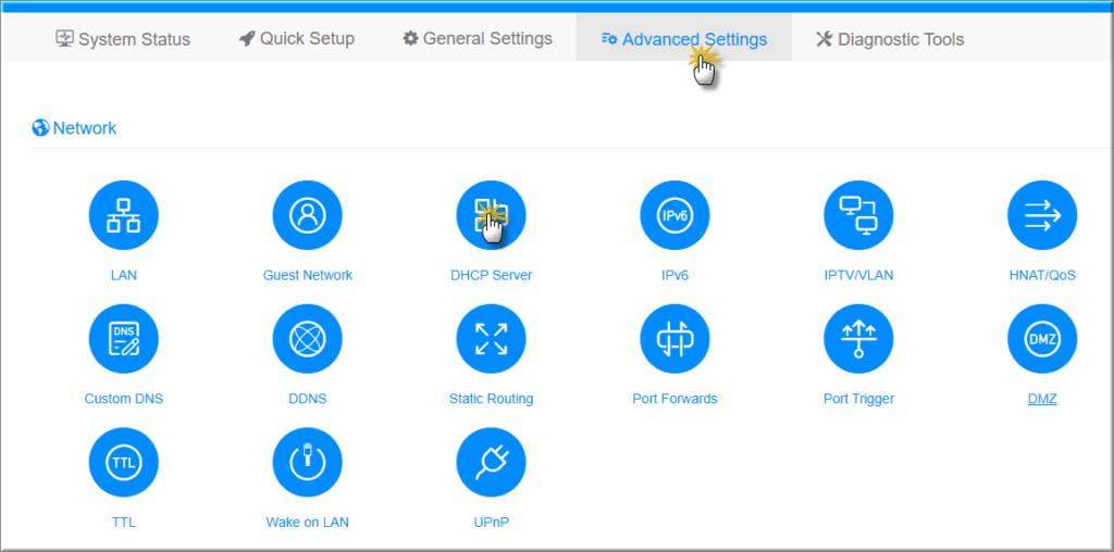 • Vào Advanced Settings >> DHCP Server, cấu hình DHCP và đổi DNS cấp cho mạng nội bộ
