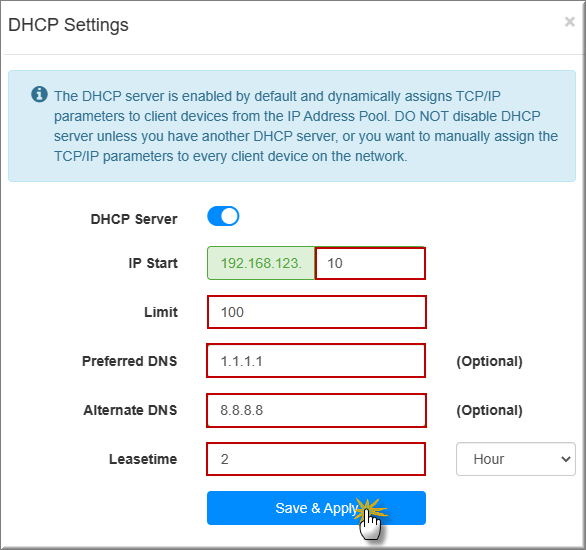 • Start IP: điền IP bắt đầu cấp (ví dụ 192.168.123.10)
