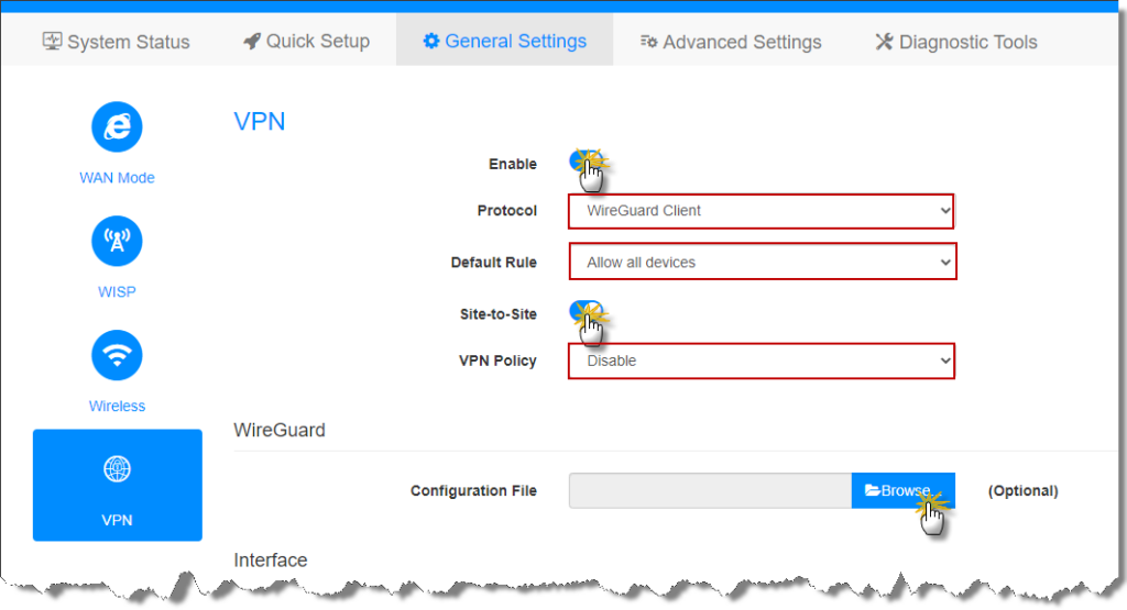 - Nhấn Browse chọn file config Wireguard đã download trên DrayTek