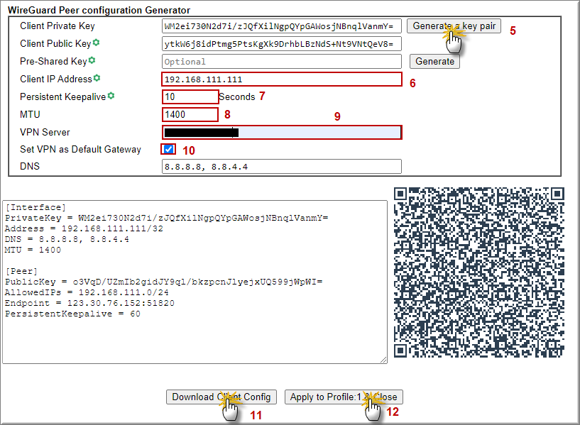 Lưu ý: file config và mã QR code đúng với client Private key/ Client public key vừa Generate. NếuGenerate lại thì File cũ không còn tác dụng, phải lưu lại file mới gởi client.