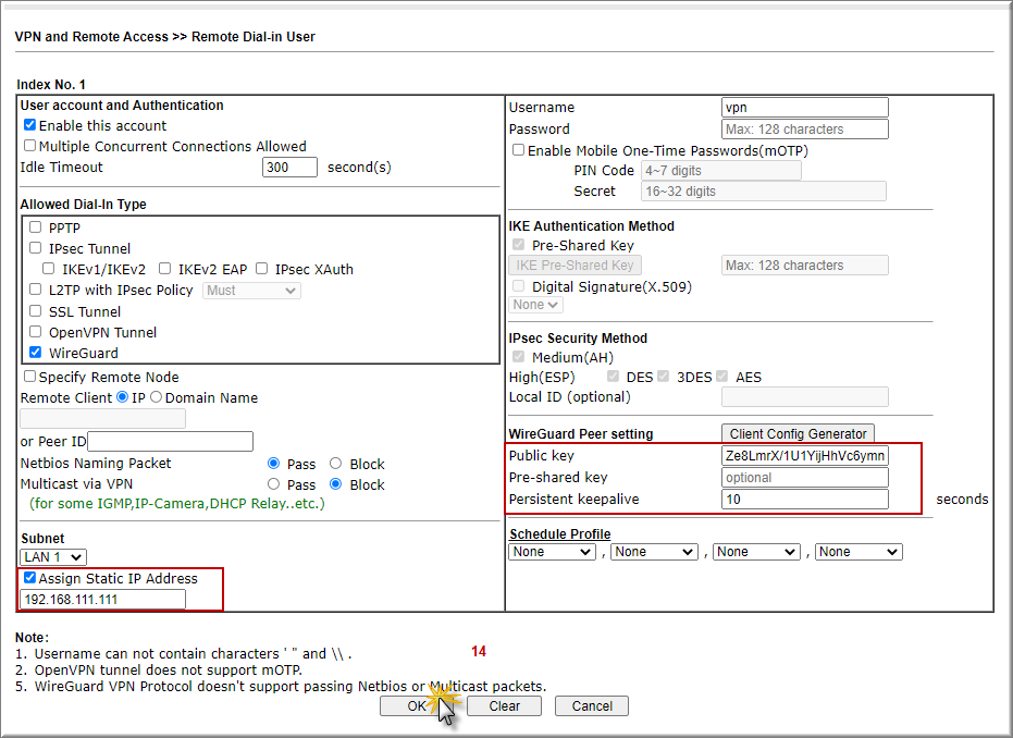 - Sau khi cấu hình xong, mục Wireguard peer setting và Aasign Static IP cấp cho client sẽ được tự động điền