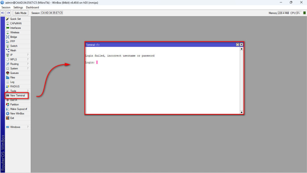 • Dùng winbox đăng nhập vào thiết bị, chọn New terminal để bắt đầu cấu hình.