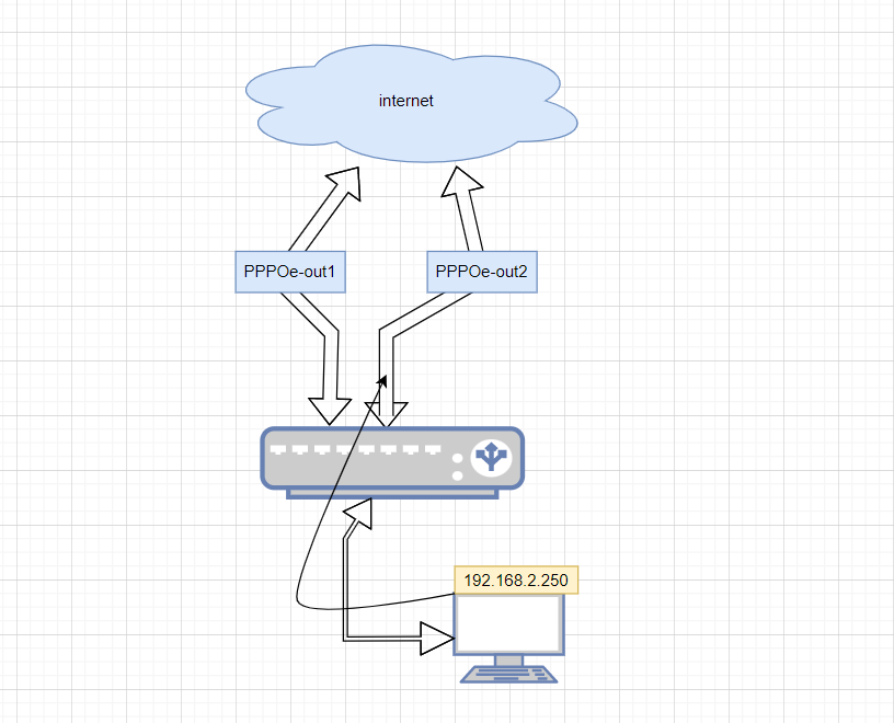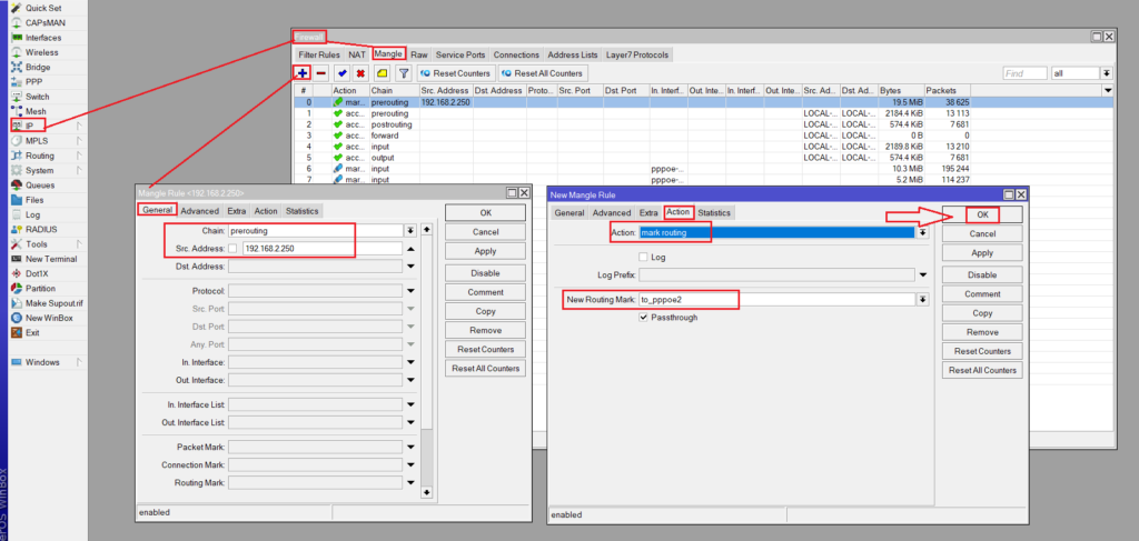 /ip firewall mangleadd chain=prerouting src-address=192.168.2.250 action=mark-routing new-routing-mark=to_pppoe2/ip routeadd dst-address=0.0.0.0/0 gateway=pppoe-out2 routing-mark=to_pppoe2 |