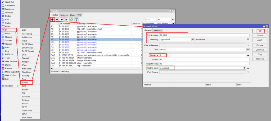 /ip firewall mangleadd chain=prerouting protocol=tcp dst-port=80 action=mark-routing new-routing-mark=to_pppoe2/ip routeadd dst-address=0.0.0.0/0 gateway=pppoe-out2 routing-mark=to_pppoe2 |
