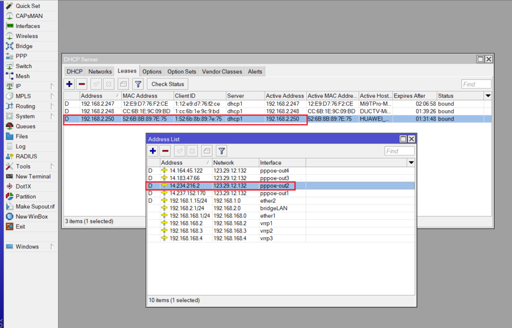 Ví dụ trên đây tôi cần định tuyến thiết bị có Ip address: 192.168.2.250 ra internet bằng pppoe-out2 hiện có.