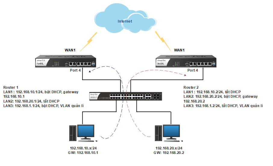 - 2 Router, mỗi router kết nối 1 đường Internet