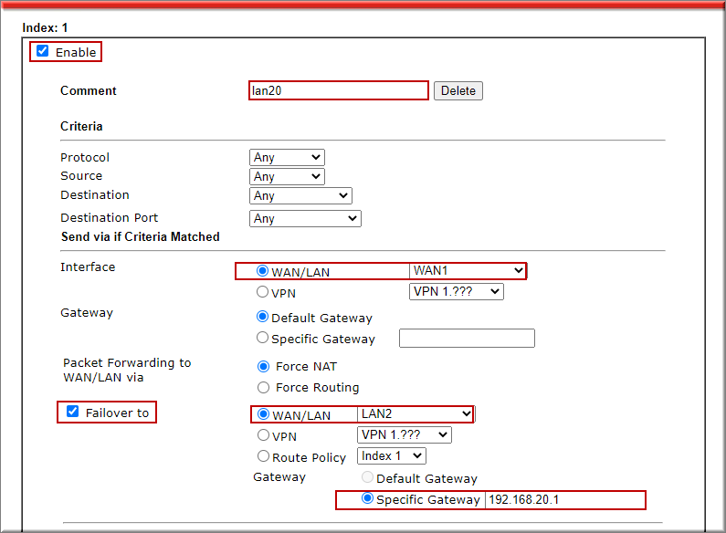 - Check Failover to chọn WAN/ LAN và chọn LAN1