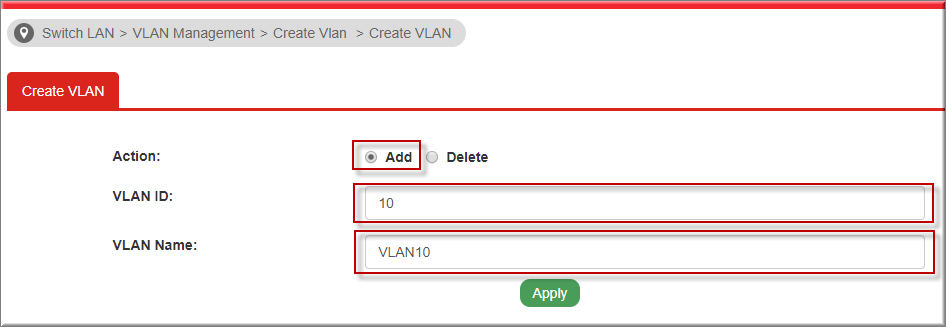 Vào Switch LAN >> VLAN Management >> Create VLAN