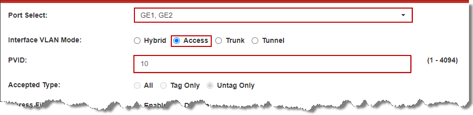 Vào Switch VLAN>> VLAN Management>> Interface Settings