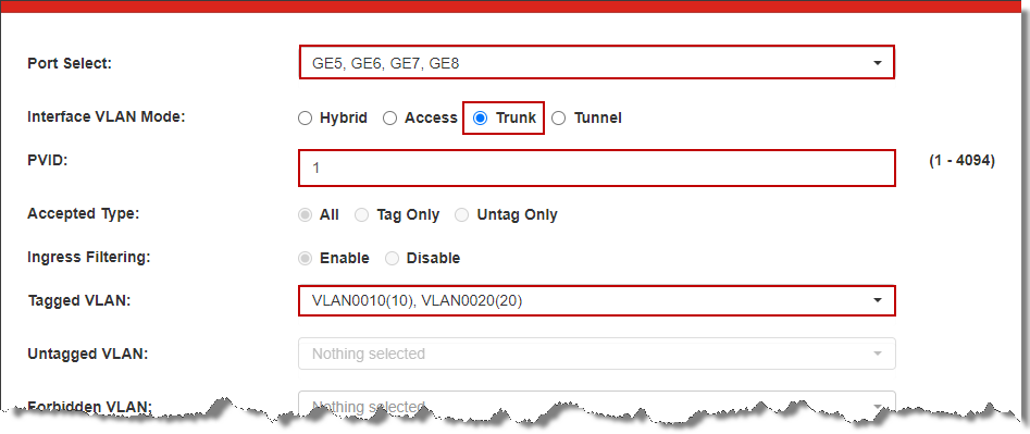 Cấu hình port 5,6,7,8 (có PVID 1 và Tag VLAN 10,20)