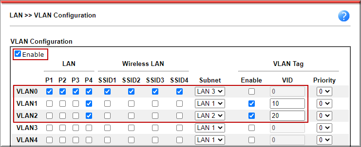 - LAN1 có VLAN ID 10, lớp 192.168.10.1/24, bật DHCP server