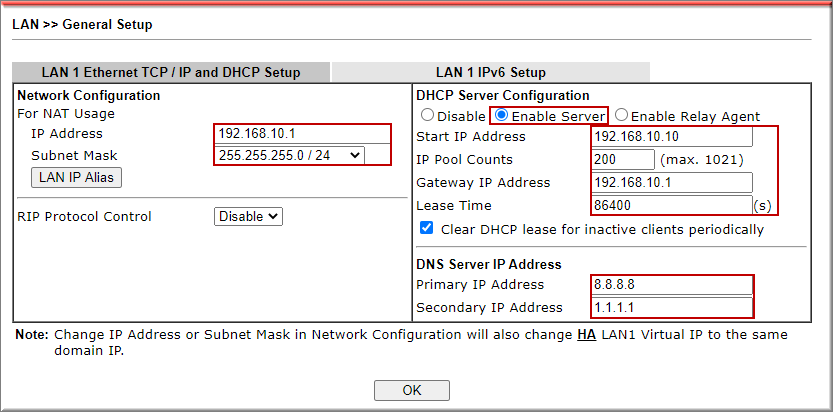 - LAN1: 192.168.10.1/24, bật DHCP serer
