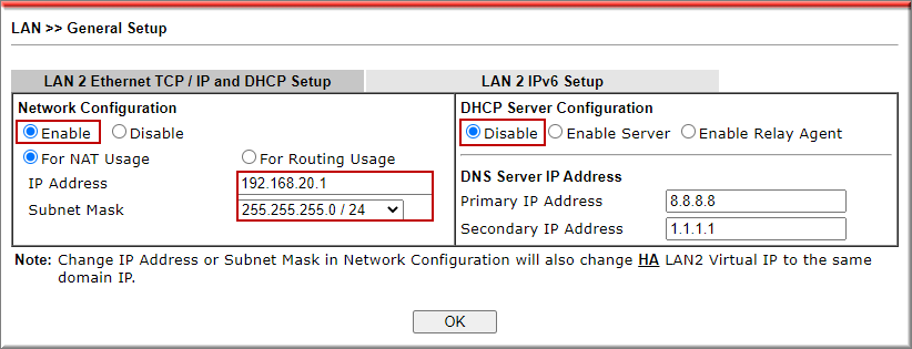 - IP Address: Điền IP lớp mạng 192.168.20.1