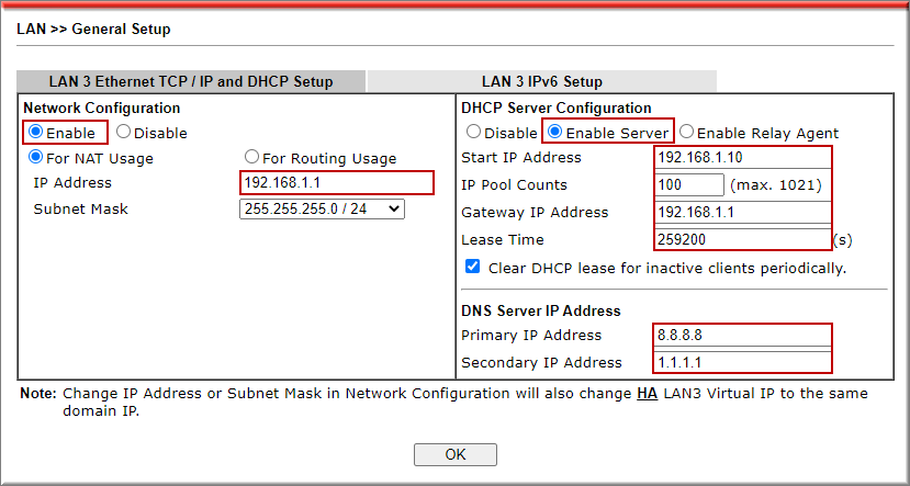 - LAN3: lớp mạng quản lý 192.168.1.1/24, bật DHCP server