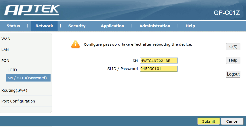 Bước 4: Vào Network > PON > SN / SLID(Password)