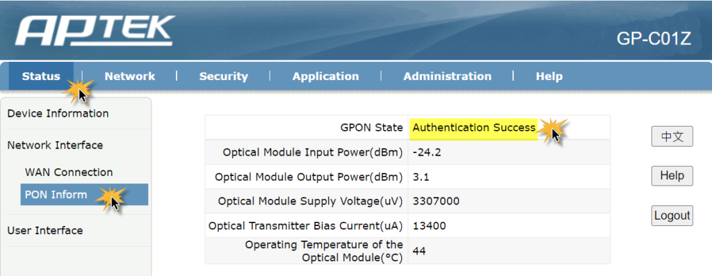 Vào Status > Network Interface > PON Inform