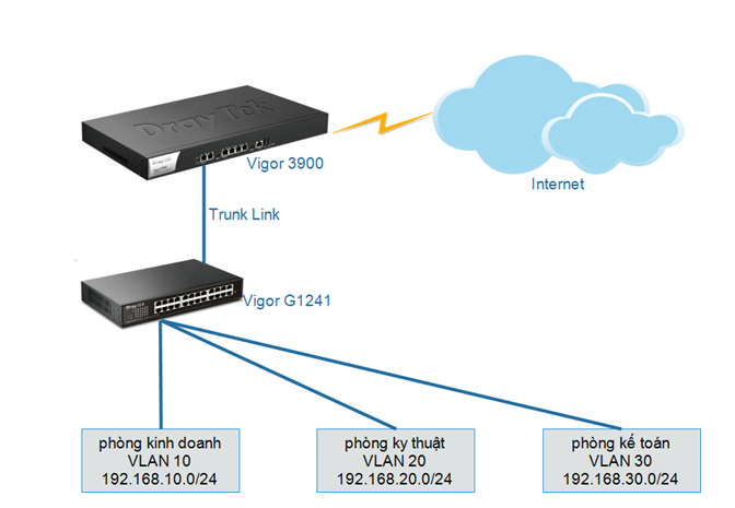 - Các port từ 1 đến 4 sẽ thuộc VLAN 10 (Tức là: các máy tính khi nối vào port này sẽ nhận được IP của lớp mạng 192.168.10.0/24 do router Vigor 3900 cấp).