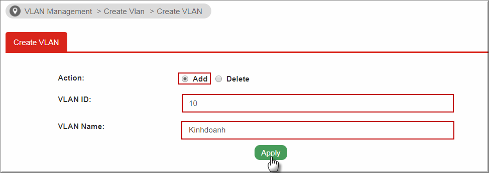 - Tạo VLAN: Vào Switch VLAN>> VLAN Management>>Create VLAN