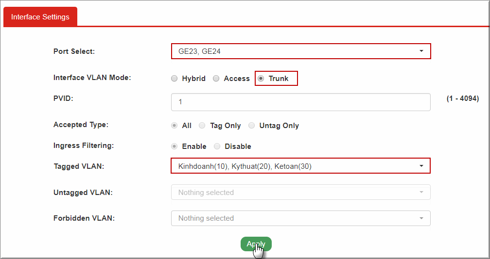 - VLAN ID: Điền VLAN ID tương ứng (ví dụ VLAN ID =10 của phòng Kinhdoanh)