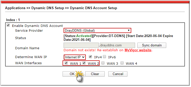 Lưu ý, Nếu Router DrayTek đứng sau thiết bị nhà mạng, router khác. Không kết nối internet trực tiếp thì phần Determine WAN IP chọn Internet IP để tên miền cập nhật IP Internet thực tế của bạn.