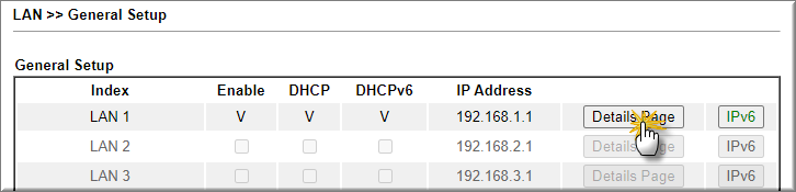 Vào LAN >> General Setup, tại LAN1 nhấn Details Page.