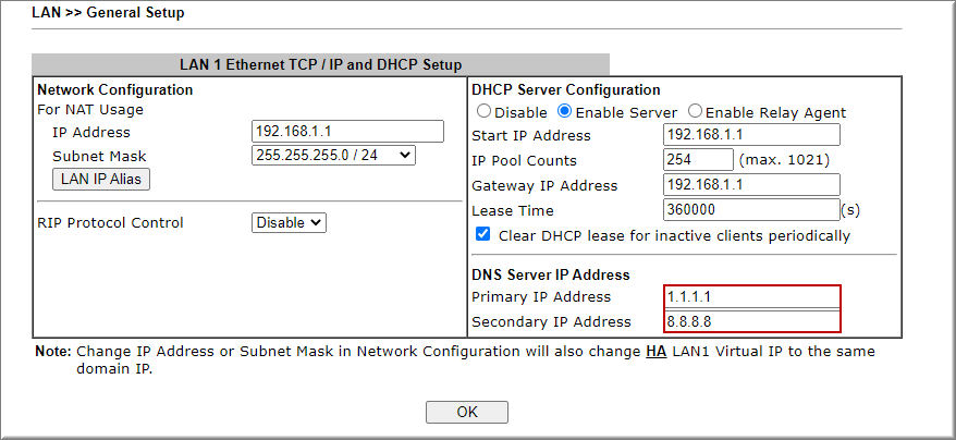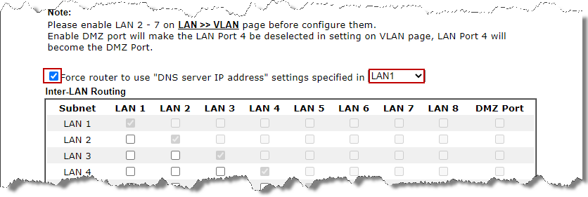 Vào LAN >> General Setup, kéo xuống và check vào “Force router to use “DNS Server IP Address” setting Specified in”, chọn LAN1 >> nhấn OK