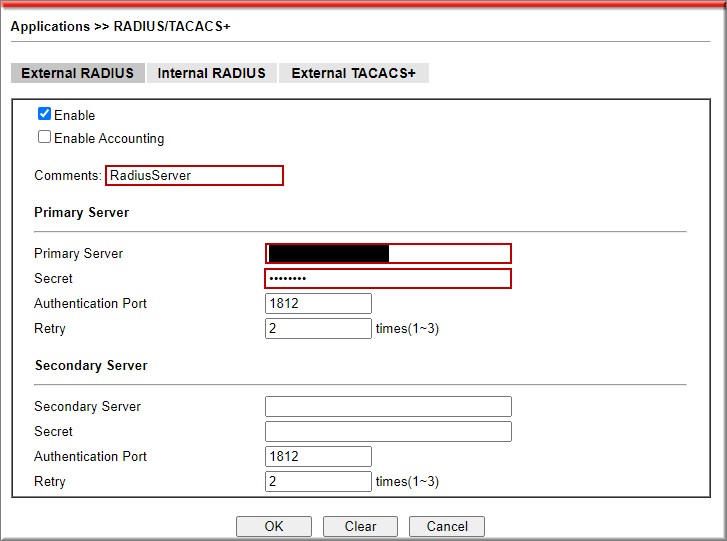 - Secret Key: Điền mật khẩu xác thực RADIUS