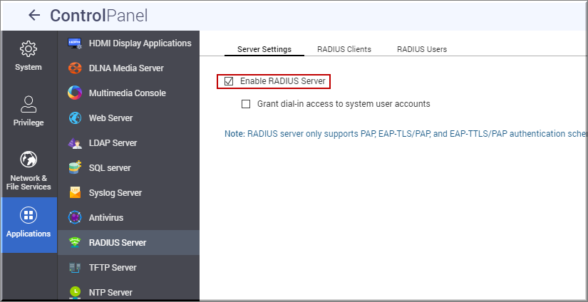 - Tại tab Server Settings, Check Enable RADIUS Server >> nhấn Apply