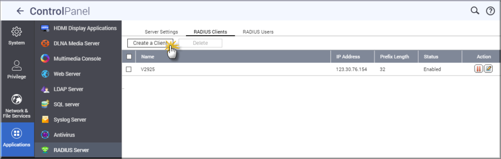 - Tại tab RAIDUS Clients, nhấn Create a Client