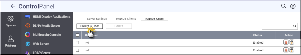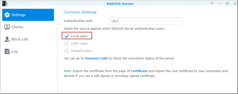 - Tại menu Settings, Chọn Local User >> nhấn OK (RADIUS server sẽ dùng user đã được cấu hình trong ổ NAS để xác thực)