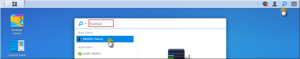 - Chọn biểu tượng “tìm kiếm” ở góc trên bên phải màn hình>> Gõ Raidus>> chọn Radius Server tại kết quả tìm kiếm