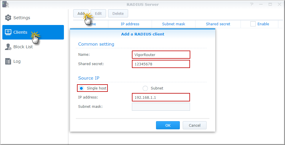 - Secret: điền mật khẩu xác thực RADIUS server (chính là Secret khi cấu hình RAIDUS client trên ổ NAS)