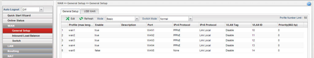 - Chọn profile WAN: 5 profile WAN tương ứng với 5 port WAN vật lý trên Vigor3900, ví dụ bạn chọn cấu hình cấu hình WAN trên port WAN 1, click vào profile wan 1. Cấu hình WAN trên port 2, click vào profile wan 2.