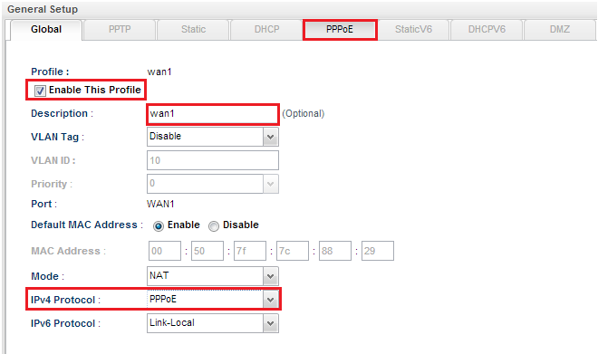 Click vào chọn Enable This Profile, chọn mode NAT, chọn IPv4 Protocol là PPPoE, click vào PPPoE.
