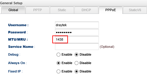- Thay đổi giá trị thông số MTU/MRU: thông số mặc định MTU/MRU trên Vigor3900 là 1492, cần thay đổi sang giá trị 1438 hoặc 1442 hay 1480